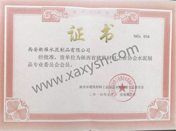 西安新雁水泥制品有限公司為陜西省建筑材料工業(yè)協會水泥制品專業(yè)委員會會員